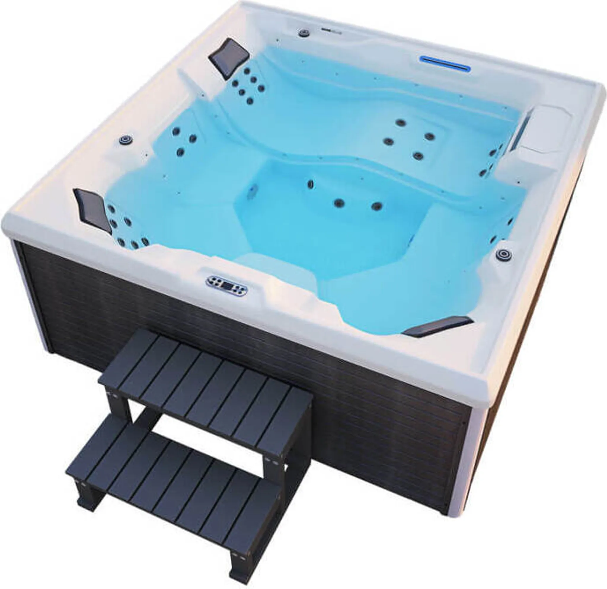 Tauche ein in das bis zu 40 °C warme Wasser und spüre, wie 140 belebende AirJet™-Düsen eine sanfte Sprudelmassage mit warmer Luft erzeugen, die jede Anspannung löst. Während Du auf einem der vier mitgelieferten, gepolsterten Schaumkissen entspannst, taucht der integrierte LED-Leuchtstreifen das Wasser und Deine Umgebung in ein faszinierendes Farbenspiel. Über die Fernbedienung wählst Du die Stimmung, die perfekt zu Deinem Abend passt. Der elegante Boden in Kieselmosaik-Optik rundet das stilvolle Ambiente ab, während die in die Pumpeneinheit integrierten Getränkehalter dafür sorgen, dass Dein Lieblingsgetränk immer griffbereit ist.