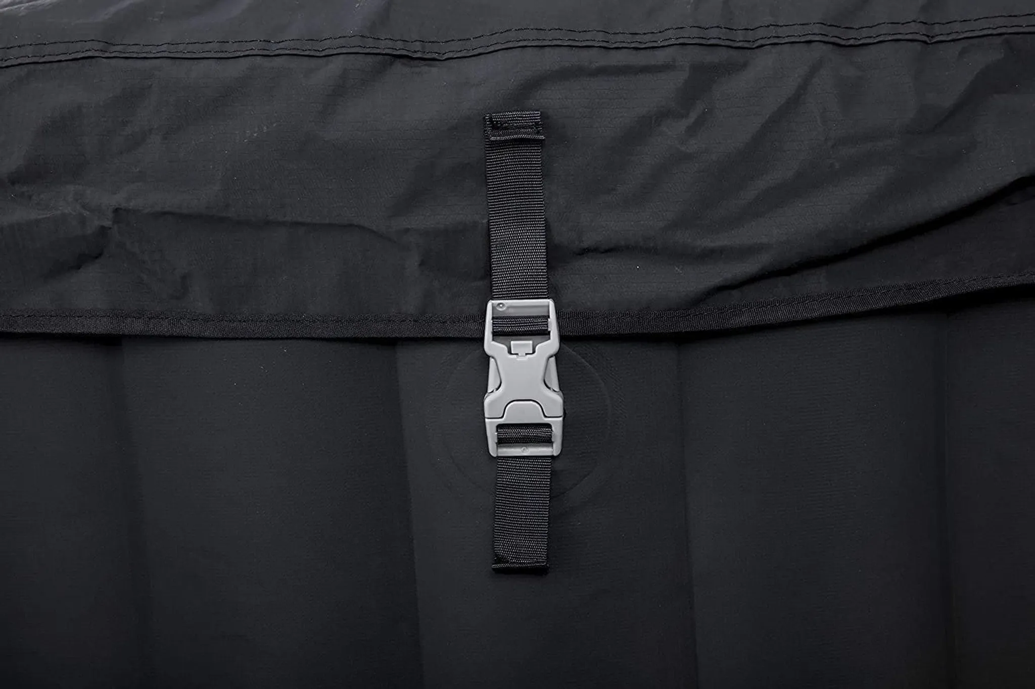 Die Installation des aufblasbaren Whirlpools dauert ca. 12 Minuten ohne Werkzeug, da alles, was Sie benötigen, bereits im Paket enthalten ist. Im Inneren finden Sie alles, was Sie für die Inbetriebnahme und Wartung benötigen, wie den chemischen Schwimmer, der ständig Chlor in der Wanne verteilt, das Filtersystem mit der Filterpatrone und die verstärkte Abdeckung mit Sicherheitsklammern, um das Spa bei Inaktivität zu schützen. Einmal durch die Ablassschraube entleert, lässt es sich leicht auf sehr kompakte Weise zusammenfalten und nimmt sehr wenig Platz ein.