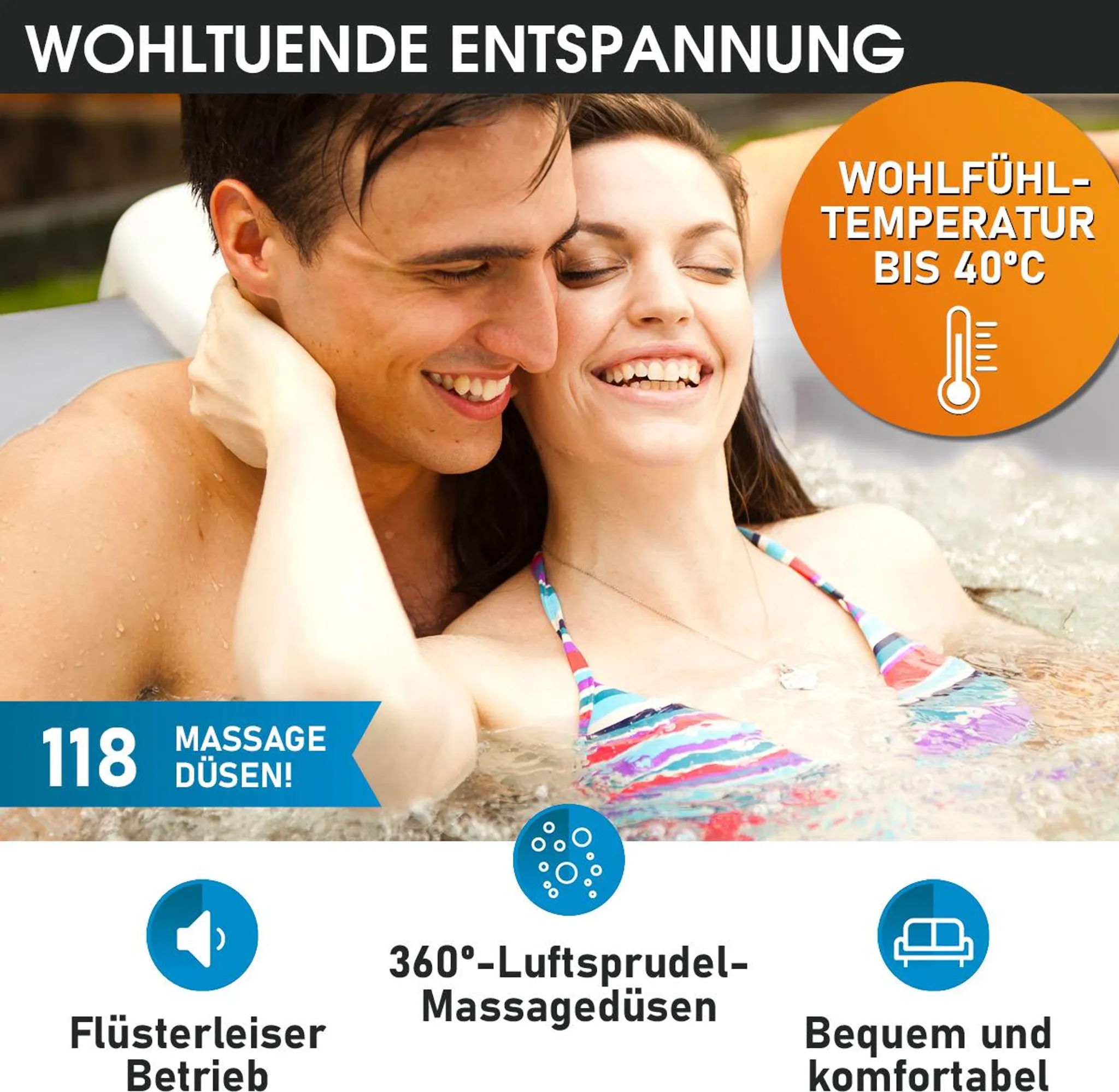 - Wohltuende Entspannung: Erleben Sie in Ihrem Zuhause ein exklusives Spa-Wellness-Erlebnis mit unserem aufblasbaren aufblasbaren Whirlpool BERGEN. Der Garten Whirlpool gehört zu den leisesten weltweit und verwöhnt Sie mit 118 Luftsprudel-Massagedüsen, die tausende Blasen erzeugen und für ultimative Entspannung sorgen. Die Wassertemperatur lässt sich bequem und präzise bis zu 40°C einstellen.