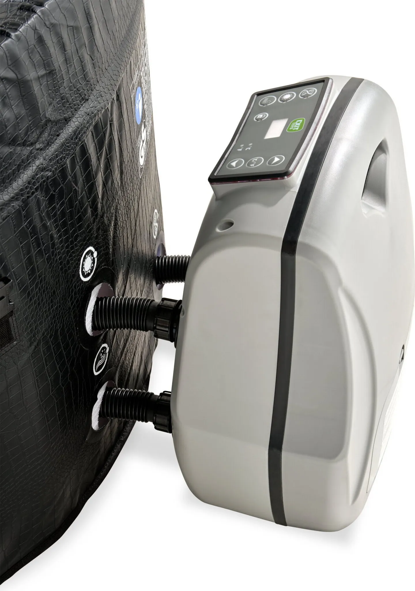 Der EXIT Leather Premium Whirlpool ø184x73cm ist ein Whirlpool, der Wellness-Feeling in den eigenen Garten bringt. Der schwarze Whirlpool wird standardmäßig mit einer Filterpumpe, die auch heizen kann und einem aufblasbaren Deckel mit einer isolierenden Abdeckplane geliefert. Der Whirlpool bietet Platz für vier Personen und wirkt dank des schicken schwarzen Leder-Prints ausgesprochen edel. Der EXIT Leather Premium Whirlpool hat eine schwarze Außenseite mit Ledermuster und eine weiße Innenseite. Dieser Whirlpool hat eine Schaumstoffwand von nicht weniger als 12 Zentimetern Dicke und ist daher stabil und isolierend. Dank der Schutzfunktion des Whirlpool-Bodens ist keine separate Bodenplane erforderlich. Darüber hinaus bietet der Schaumstoffboden einen ausgezeichneten Sitzkomfort. Mit dem aufblasbaren Whirlpool-Deckel und der isolierenden Abdeckplane inklusive Sicherheitsschloss schließt du den Whirlpool luftdicht ab und bleibt das Wasser warm. Der EXIT Leather Premium Whirlpool ist dank seiner Multifunktionspumpe, die das Wasser reinigt und gleichzeitig auf bis zu 40 Grad Celsius erhitzt, praktisch wartungsfrei. Mit dem digitalen Bedienfeld kannst du ganz einfach die Temperatur einstellen und die 120 Luftdüsen aktivieren, um für ordentlich Bläschen zu sorgen.