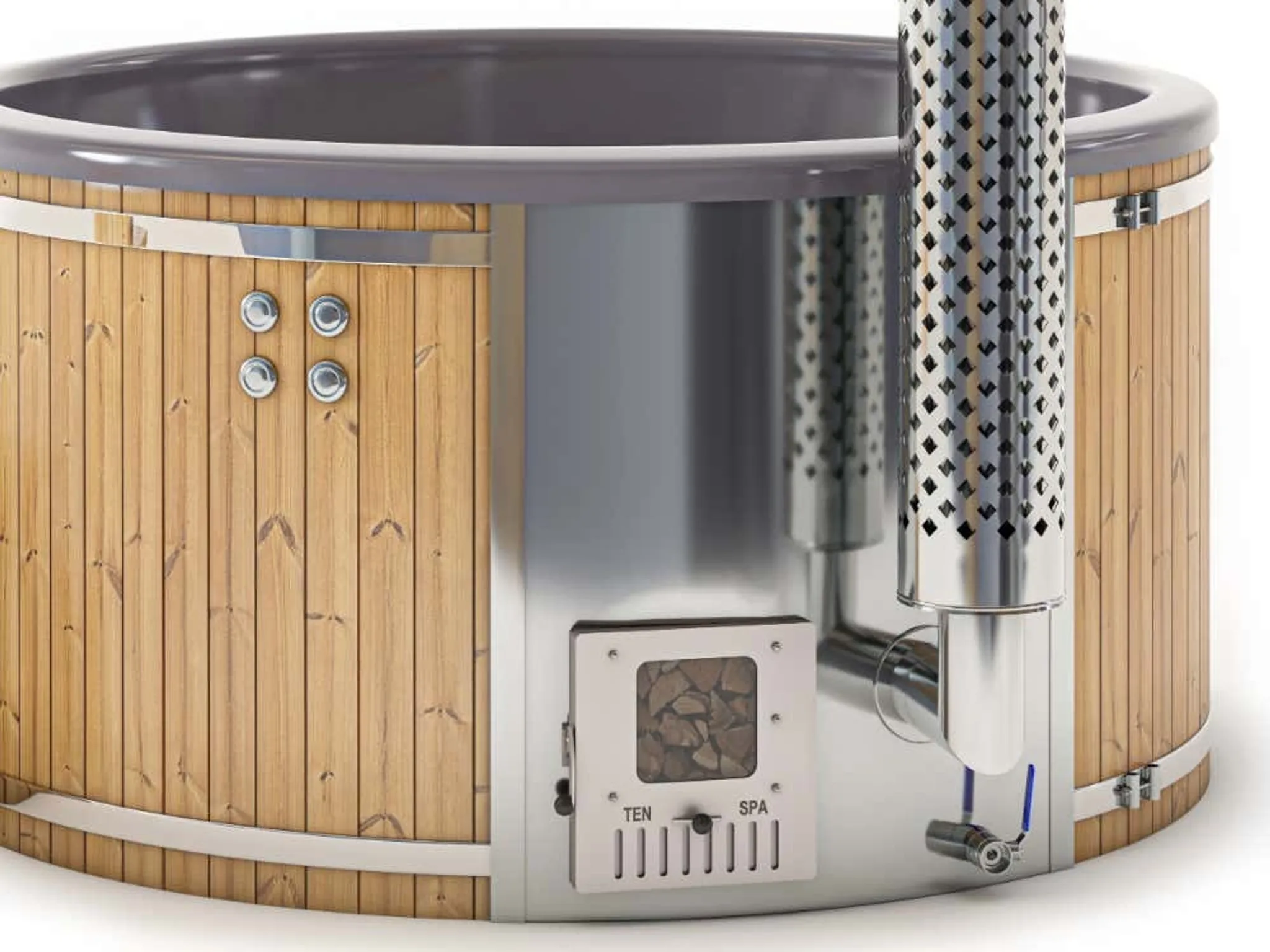 Finntherm Holz Badefass Stockholm aus Thermoholz, Whirlpool, Hot Tub Ø 180 cm, in Anthrazit, 8 Personen, inkl. Edelstahl-Ofen (30 kW), Schwimmbecken, Badebottich, Sprudelbad