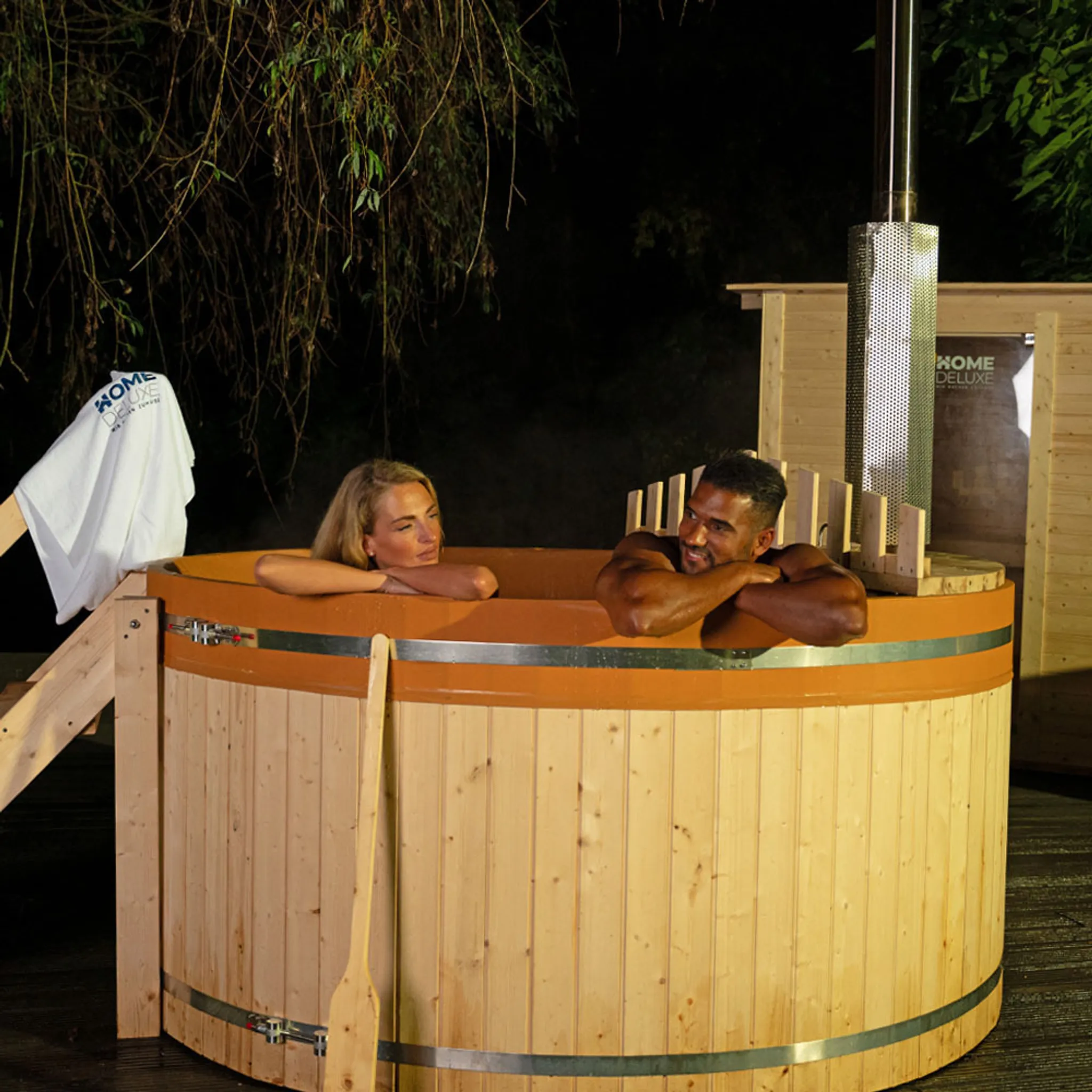 Ob im Garten oder auf der Terrasse mit unserem traditionellen Badefass SKANDI fühlst du dich wie im Urlaub. Das moderne Design, vereint mit eleganten und skandinavischen Highlights, macht den hochwertigen Outdoor Pool zu einem optischen Blickfang. Der leistungsstarke Holzofen erwärmt deinen Hot Tub binnen kürzester Zeit auf eine angenehme Badetemperatur von ca. 30 – 40C°. Durch die optimale Größe und dem runden Design kannst du deinen Hot Tub perfekt in deinem Garten platzieren und den Ausblick genießen. Das massive Holz der Außenverkleidung verspricht Langlebigkeit und besticht mit seinem modernen Aussehen. Die Innenverkleidung besteht aus einer hochwertigen und strapazierfähigen PVC-Folie und sorgt dafür, dass das Holzinnere dicht und geschützt bleibt. Durch die bequemen Holzbänke im Hot Tub erlebst du höchsten Sitzkomfort.