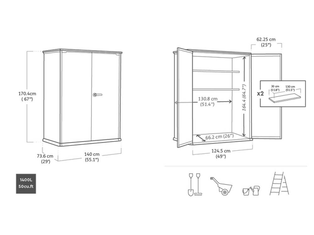- Innenvolumen von 1400 Litern: ermöglicht die Aufbewahrung einer Vielzahl von Werkzeugen und Gartenzubehör.