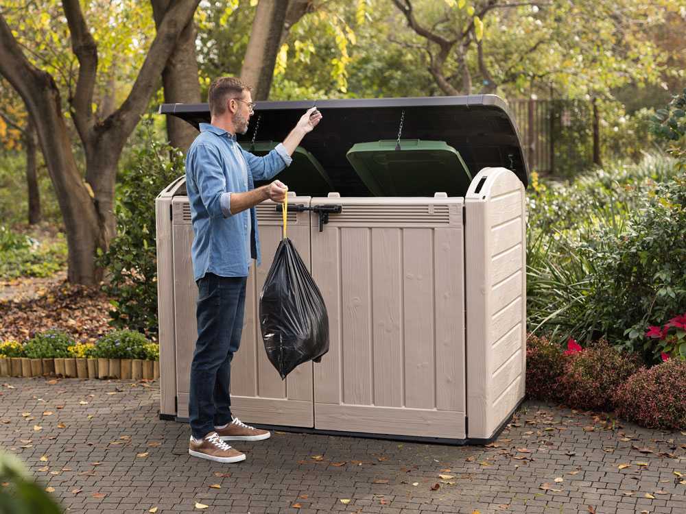 Ein Set zur Befestigung von Mülltonnen am Deckel ist im Lieferumfang enthalten und ermöglicht die Aufnahme von bis zu zwei 360-Liter-Mülltonnen oder drei 140-Liter-Mülltonnen.