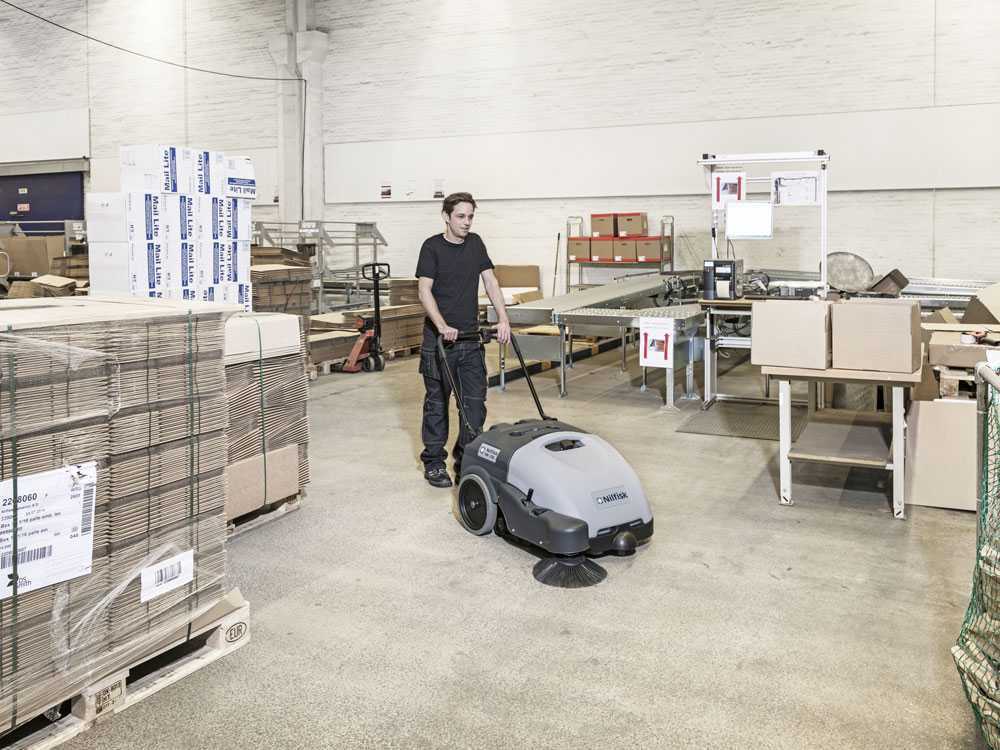Die selbstfahrende Kehrmaschine SW750 von Nilfisk mit Fangkorb ermöglicht eine effiziente und schnelle Reinigung von Innen- und Außenbereichen, selbst in engen Umgebungen.