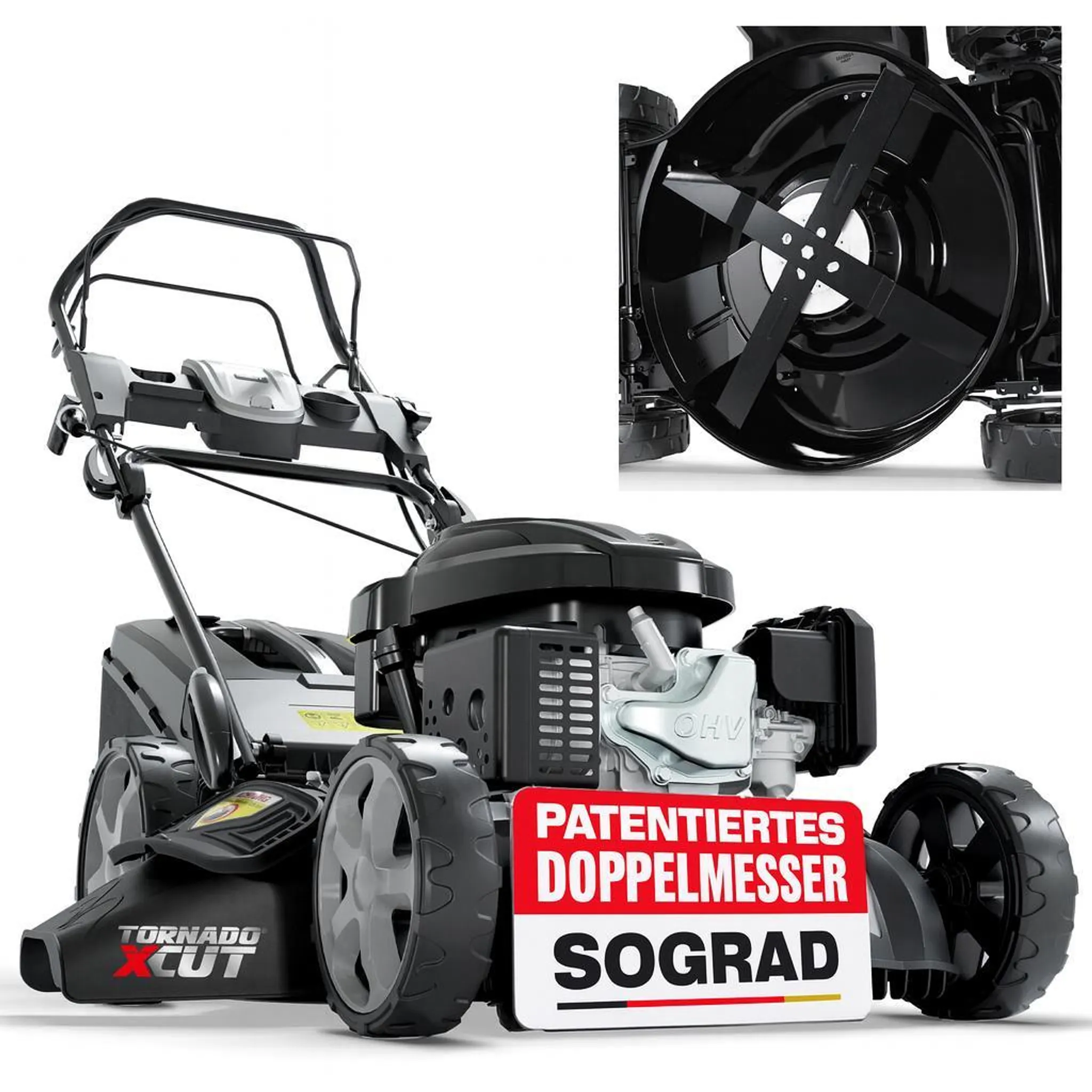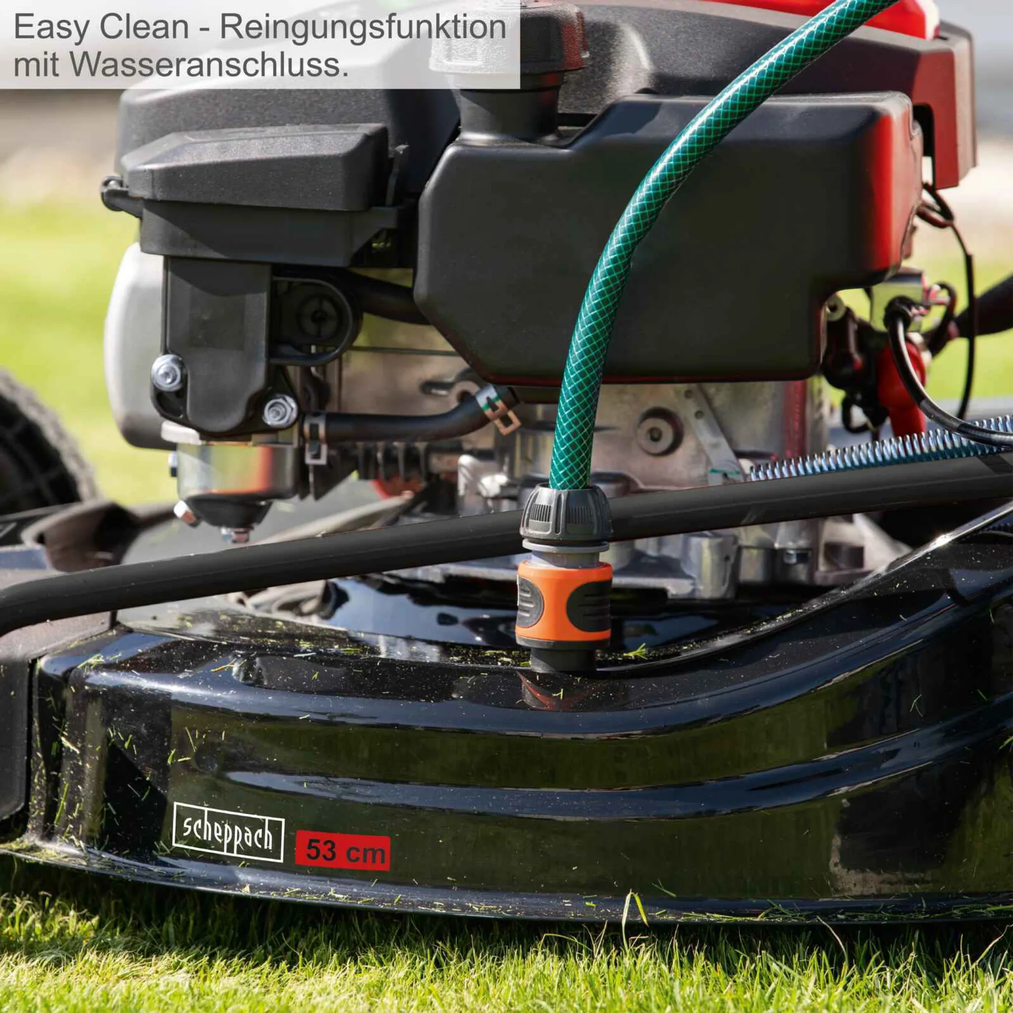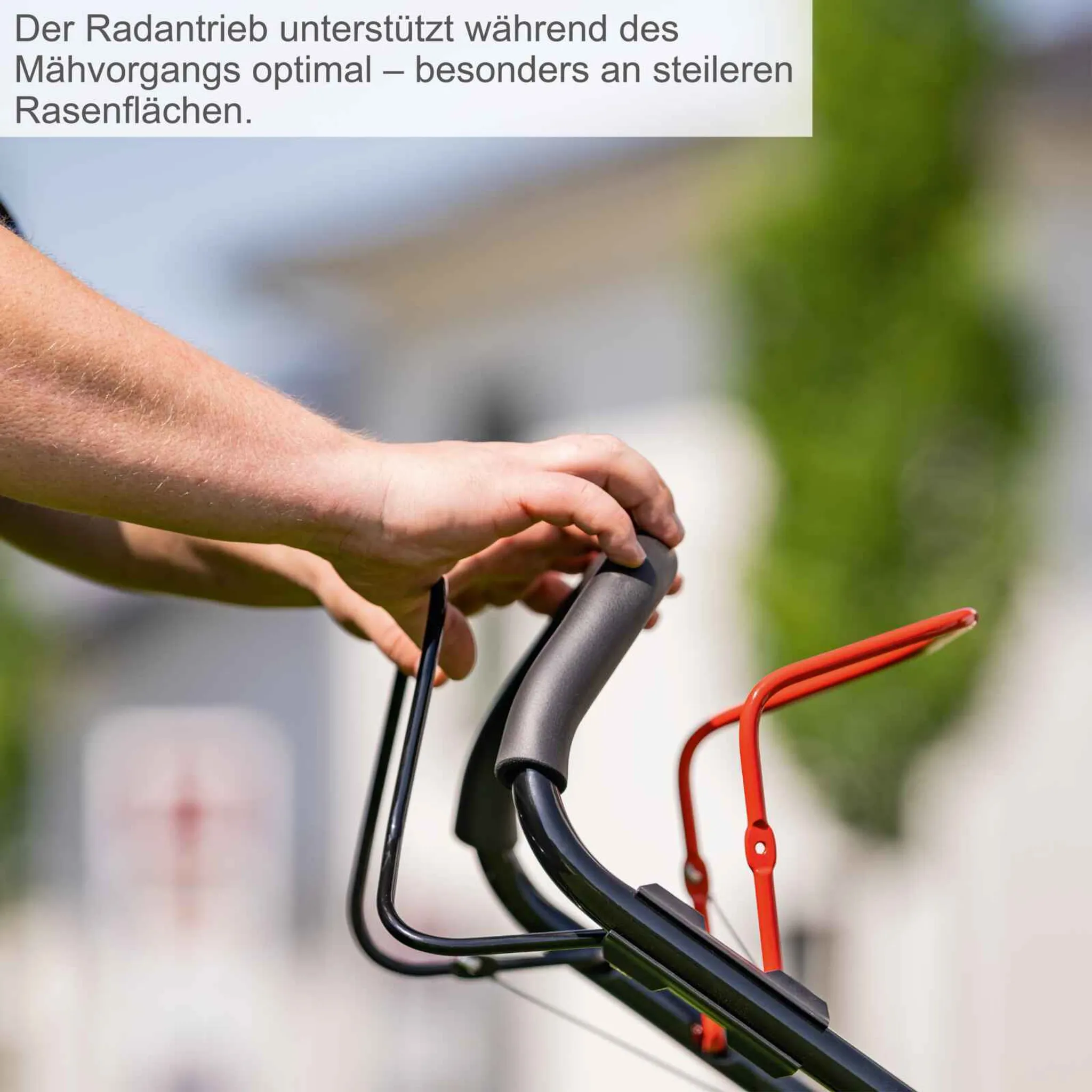 Dank Komforthandgriff, großer, kugelgelagerter Laufräder und zuschaltbarem Radantrieb lässt sich auch ein hügeliger Garten oder ein grasbewachsener Hang ganz einfach mähen. Richtig Zeit sparen kann man durch die XXL-Schnittbreite von 53 cm, die ein effizientes Rasenmähen in kürzerer Zeit ermöglicht.