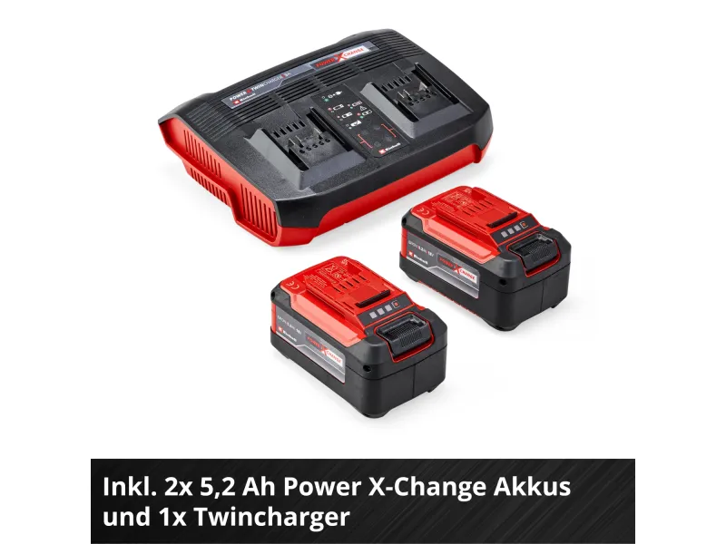 Der Akku-Rasenmäher Rasarro 36/42 wird mit zwei 5,2 Ah Power X-Change Akkus und einem Twincharger zum gleichzeitigen Laden von zwei Akkus geliefert. Der Mäher wird für Rasenflächen bis 725 m² empfohlen.