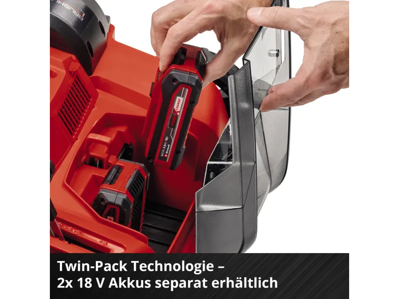 Das Kunststoffgehäuse aus schlagzähem Material ist wartungsfreundlich gestaltet. Zur Inbetriebnahme sind 2 x 18 V Akkus erforderlich. Die Lieferung erfolgt ohne Akku und Ladegerät, welche separat erhältlich sind, beispielsweise als praktisches Starter-Set von Einhell.